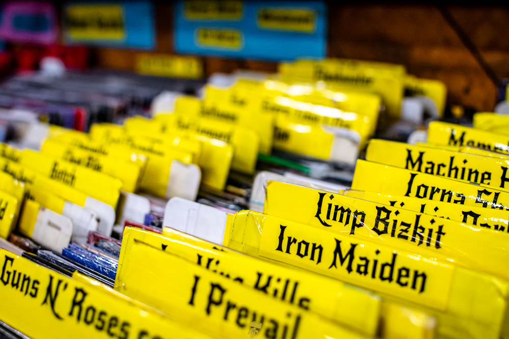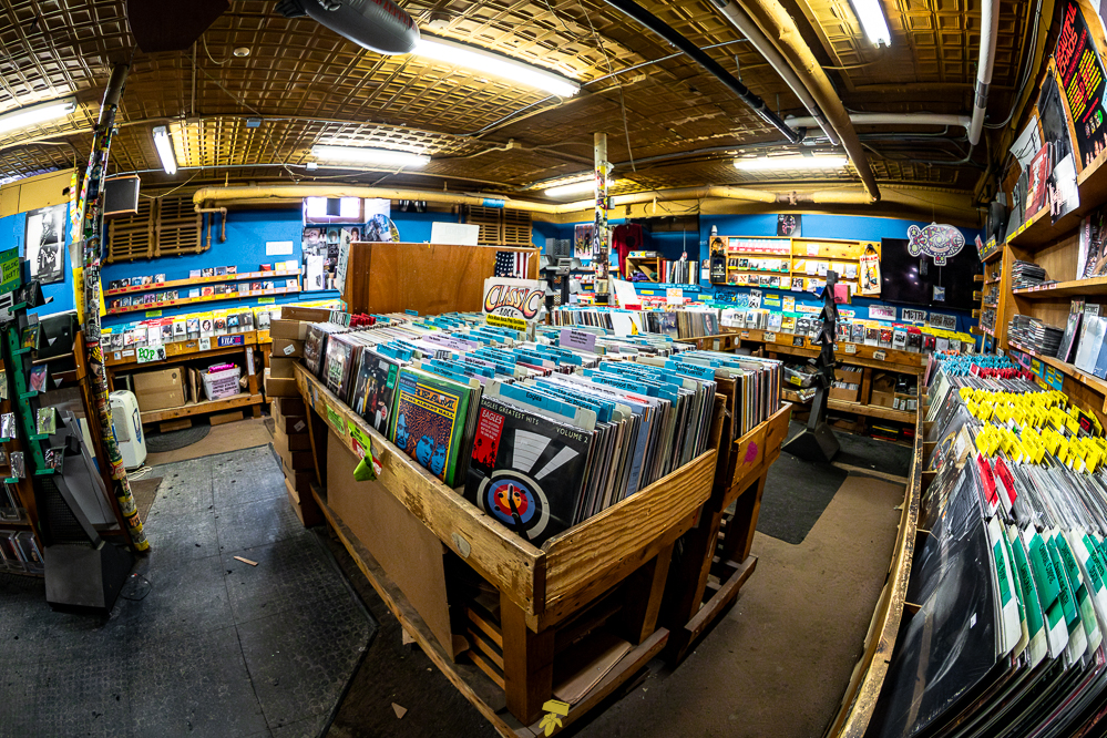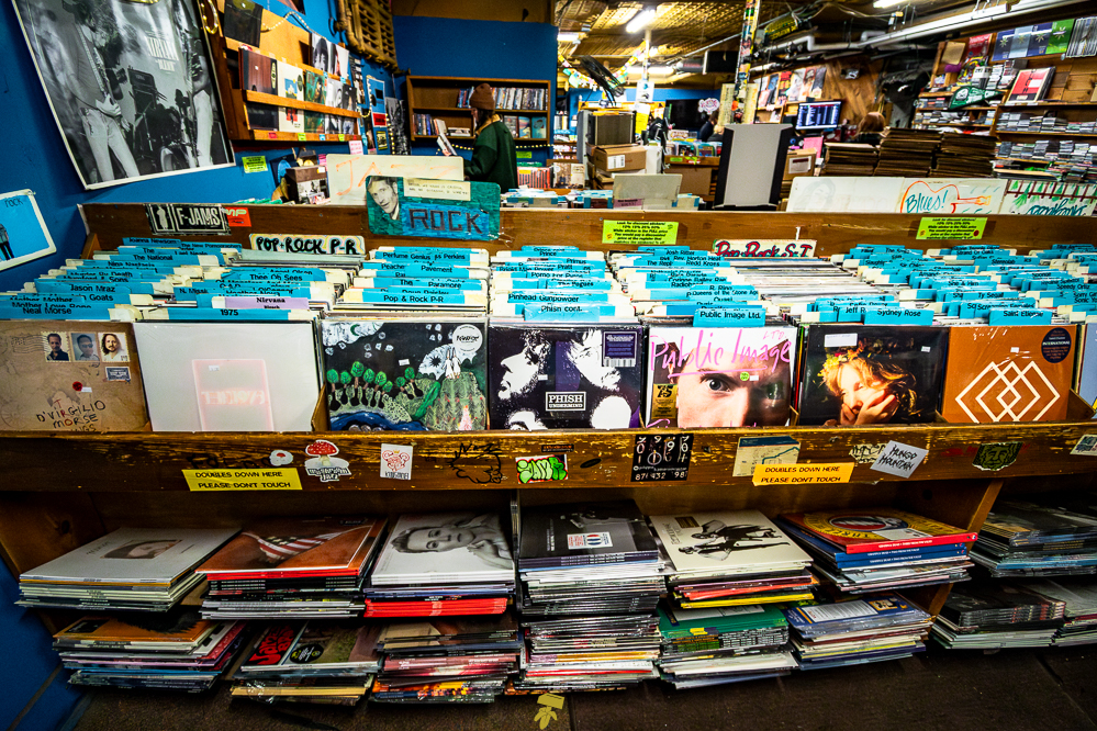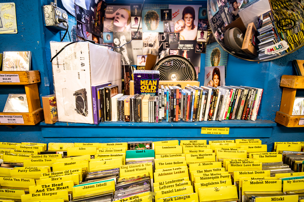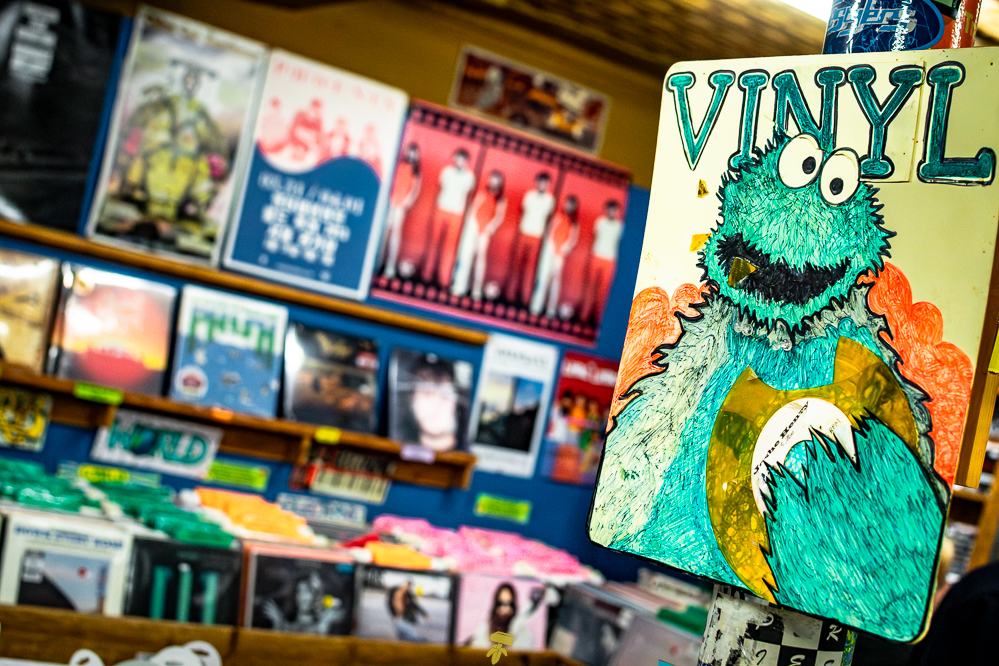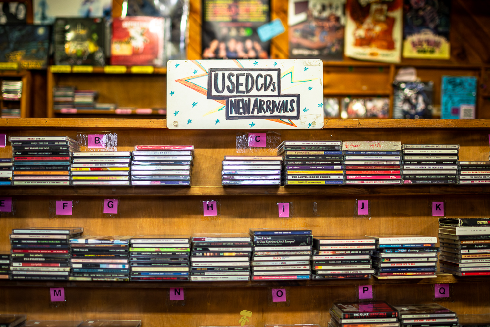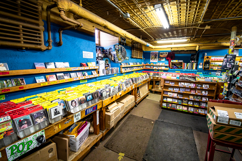 If you don’t mind uneven floors and weird basement smells, you’re bound to find treasure at Pure Pop Records. Wooden bins line the walls, with additional bins and bookcases scattered in the middle, making for quite the maze of music. Old posters of Nirvana and The White Stripes can be spotted on the walls between the gold ceiling and the dusty floor. Pure Pop is that classic record shop full of character, where signs are made by hand, stickers of local bands slapped about, and boxes of CDs, vinyl, and other items are stacked everywhere.